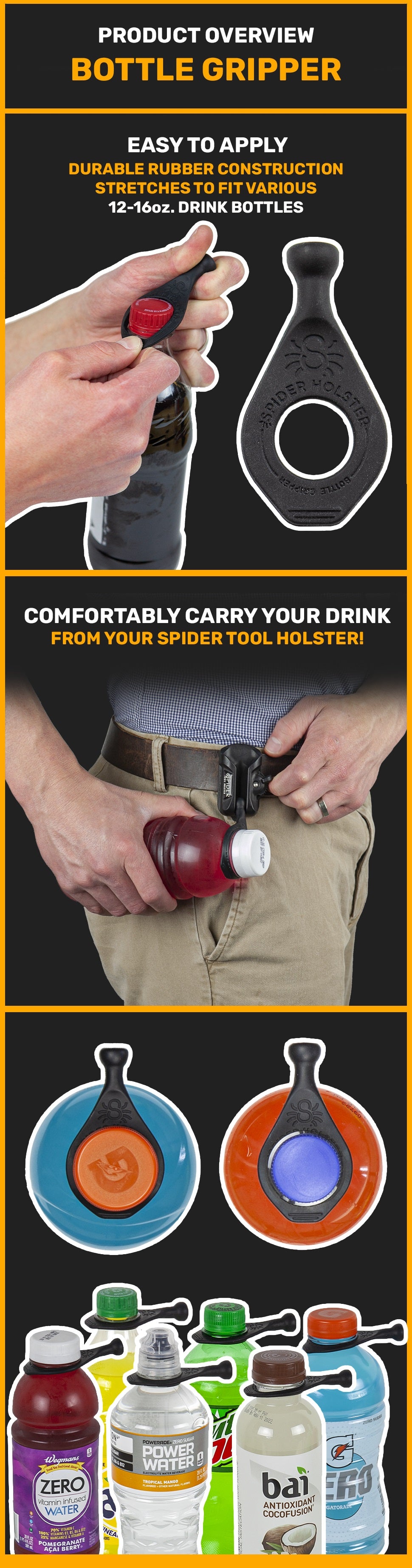 ✅ COMFORTABLE TO CARRY: The Bottle Gripper positions your drink at the perfect angle to carry it without it digging into your side.