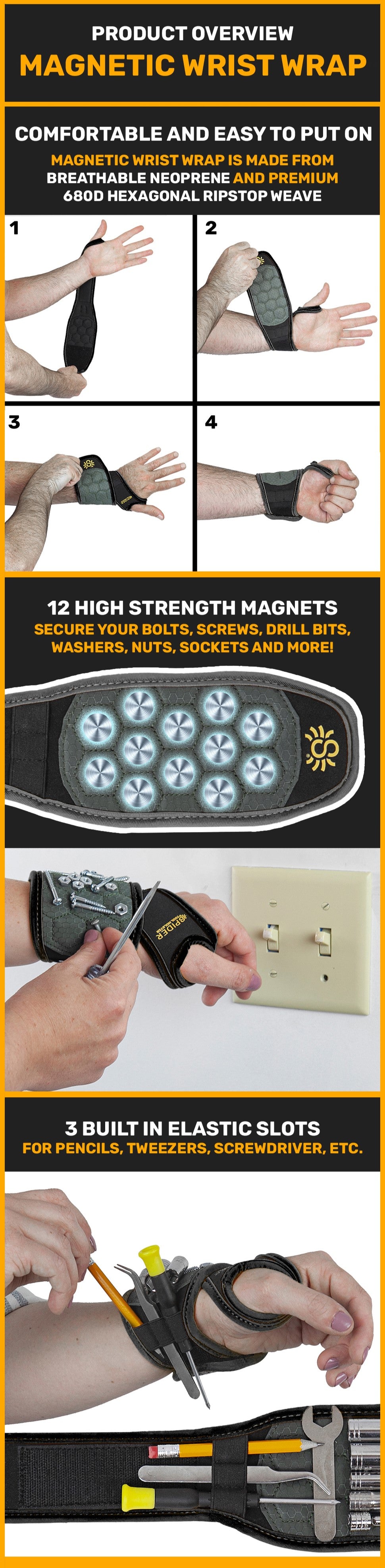 The Magnetic Wrist Wrap has 12 strong neodymium magnets built into it, which allow you to conveniently store your bolts, screws, bits, washers, sockets, pencil and more right on your wrist!