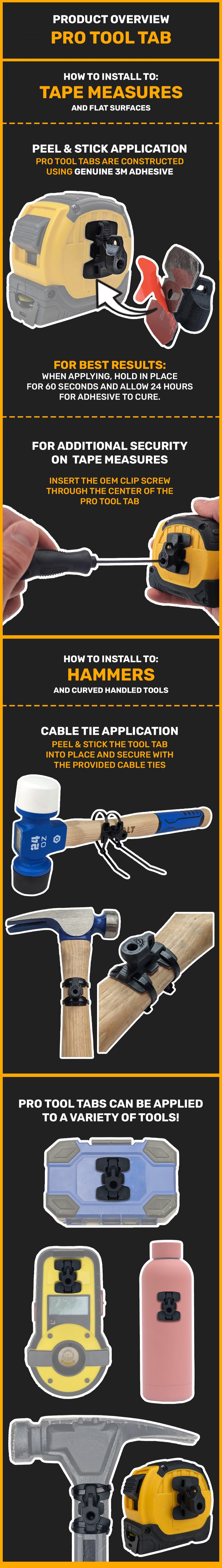 🛠️ FOR FLAT SURFACES & ROUNDED HANDLES: Pro Tool Tabs easily apply to tape measures, bit boxes, hammers, wrenches, mallets, drink bottles and more!
